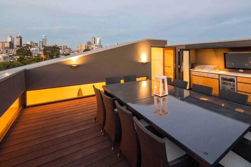 The custom design features a cinema room, designer kitchen and bathrooms, an aerial pool and rooftop decking with spectacular full city views. The interior of this property complements its contemporary exterior, including Spotted Gum flooring, imported Italian stone titles and high-end appliances throughout.