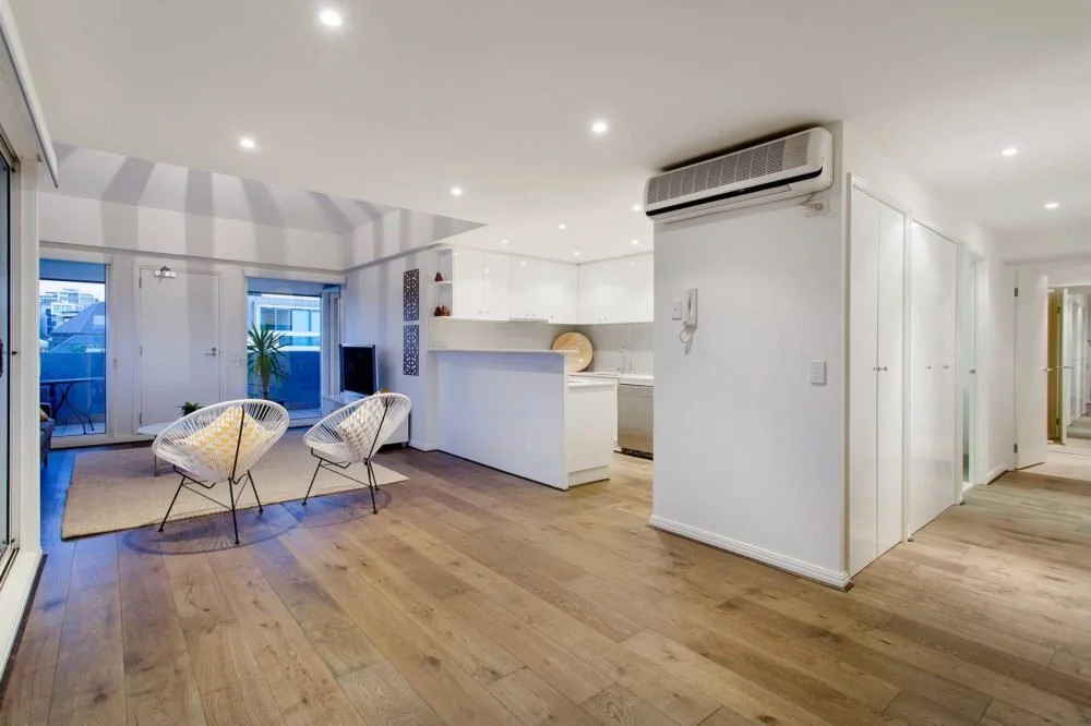 This three-bedroom apartment was brought to life with a complete renovation giving the property a very modern look and feel. The residential property was completely stripped back, creating a new custom kitchen, bathroom and reconfiguring bedrooms.